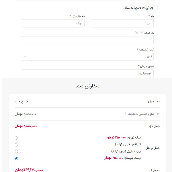 در قسمت دوم عکس بالا جزییات از مبلغ فاکتور تعداد روش حمل و نقل برای شما طراحی شده که باید یک روش رو حتما انتخاب کنید