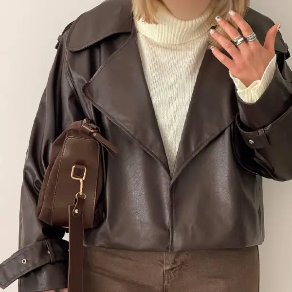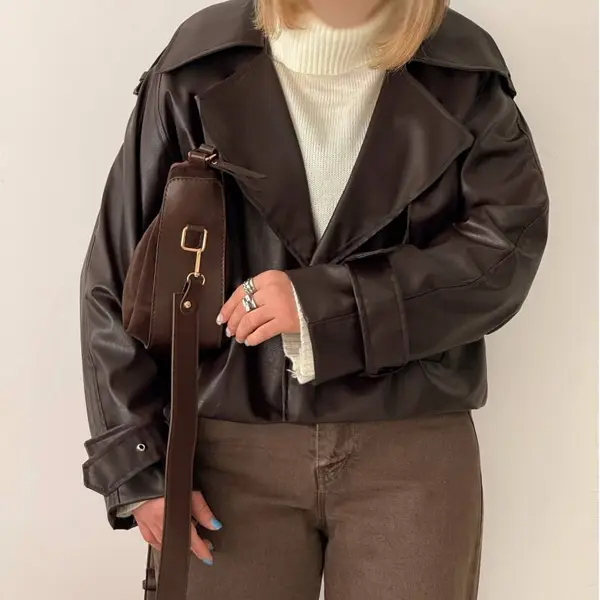 کراپ کت یقه انگلیسی زنانه با چرم مسکو گرم، فریسایز و عرضه در دو رنگ مشکی و قهوهای، مناسب فروش عمده.